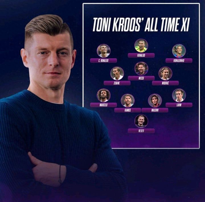 克罗斯在社交平台的原版发文(西班牙语)写道:“el ex del real madrid subió este sábado a redes el que considera el mejor once de todos los tiempos . neuer sorprende en portería . ¿Opiniones?",