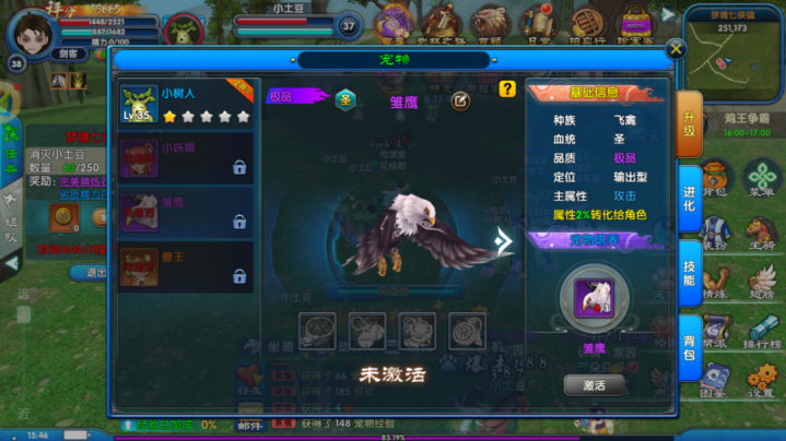 通过“开服七日连充”活动(累计充值五天,每天最低10元,总花费50元)获取的雏鹰,是新手期刷怪最好的助手,尤其适合“剑客”“枪豪”等输出职业。