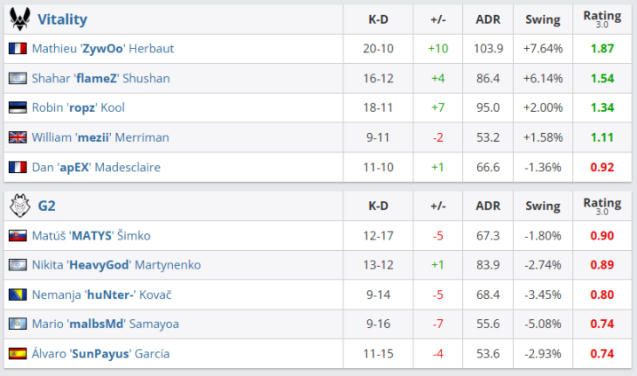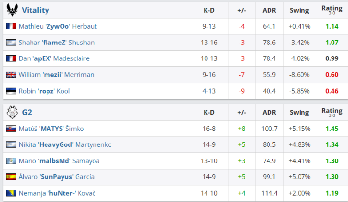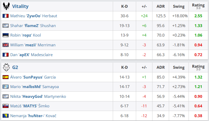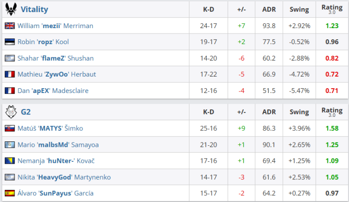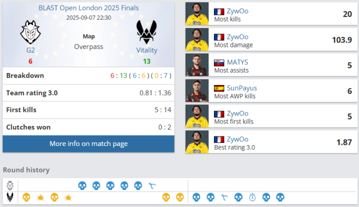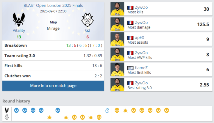 下半场易边再战。手枪局失利后,G2强起失败进入ECO局。第十六局,Sunpayus中路先拿首杀,Vitality进攻B区打成二换三后转攻A区,ZywOo三杀Vitality下半场连得四分。第十八局,Vitality爆弹A区flameZ双杀破点,Vitality拿下赛点!最终,图二Vitality13-6G2,ZywOo火力全开,Vitality轻取对手选图扳平比分!