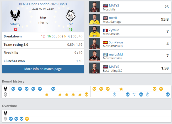虎扑09月08日讯BLAST伦敦公开赛决赛,Vitality对阵G2比赛结束,G23-2Vitality。血战五图,G2技高一筹战胜强敌Vitality,夺得BLAST伦敦公开赛冠军!