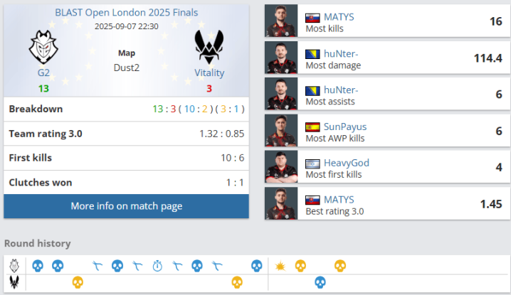 下半场易边再战。手枪局MATYS关键双杀破局,G2拿到十一分。Vitality强起失败后送出赛点。最终,图一G213-3Vitality,碾压对手选图,G2先下一城!