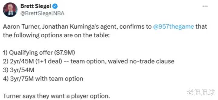而库明加的态度也很明确:要么给球员选项,要么提高合同金额。其经纪人特纳更是直接发出警告,表示如果库明加最终签下资质报价(1年790万美元),可能会损害他和球队的长期关系。言下之意显然而易见,就是如果最终没能达成库明加满意的合同,下赛季他或许会只出工不出力,间接影响球队的凝聚力,威胁意味深重。