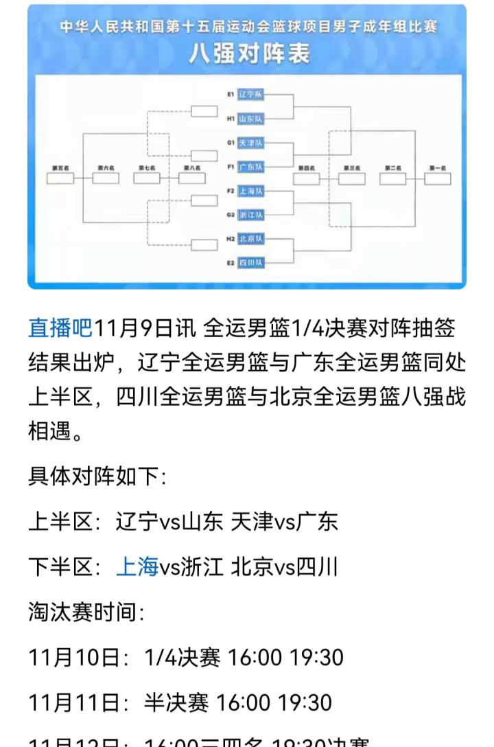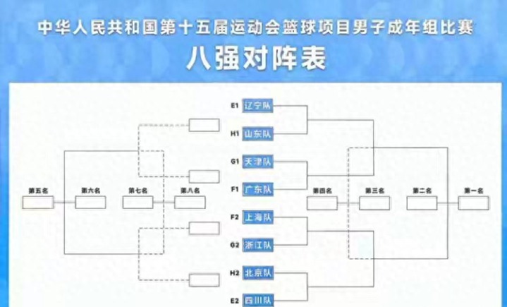 全运会男篮比赛已经结束了小组赛对决,辽宁、四川、广东、上海、北京、浙江、山东、天津八支球队,最终晋级八强。根据刚刚权威媒体直播吧的消息,目前八强赛对决及晋级形势已经确定。接下来小编分析一下,四场比赛的对决情况。