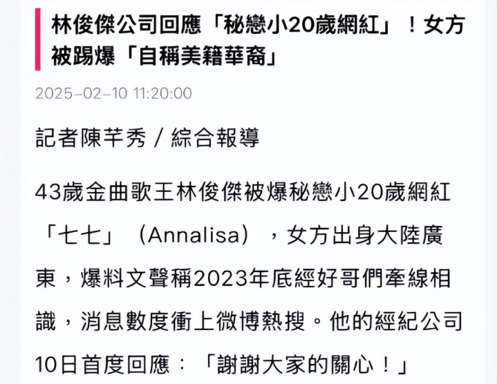 不过,在二月份林俊杰爆出和该网红的恋情后,林俊杰的经纪公司很快便回应了林俊杰恋爱一事,并谢谢大家的关心。