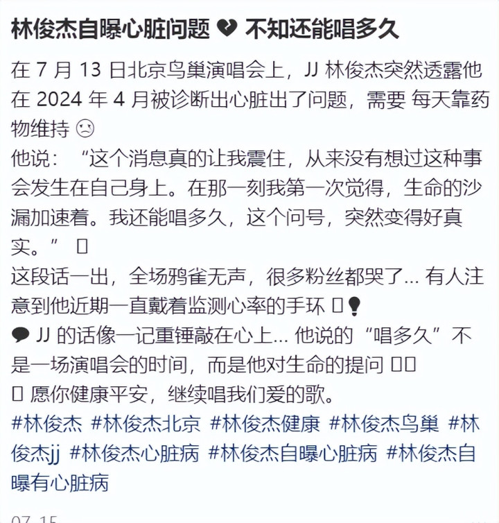在今年七月份的时候,林俊杰在北京演唱会,自爆出现了心脏问题,哽咽说自己不知道自己还能唱多久,每天都要靠药物维持,不敢相信这件事发生在自己身上。说完深深向粉丝鞠躬。