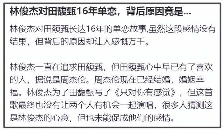 但落花有意流水无情,田馥甄却对林俊杰不感冒。当时网传田馥甄真正喜欢的人是周杰伦。从两人每次同框时田馥甄含情脉脉的眼神就能看出来。