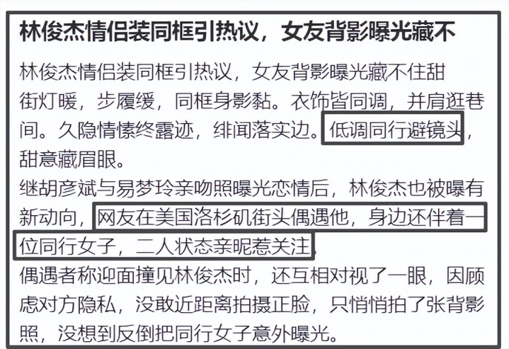 偶遇者称,当时迎面撞见林俊杰,还互相对视了一眼,因顾及隐私没有拍摄正脸,随后悄悄拍摄了背影照。没想到连其女友一同拍进镜头。