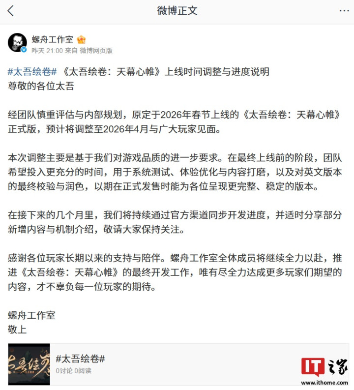 IT之家11月30日消息,螺舟工作室官方微博昨日发布《太吾绘卷:天幕心帷》上线时间调整与进度说明:经团队慎重评估与内部规划,原定于2026年春节上线的《太吾绘卷:天幕心帷》正式版,预计将调整至2026年4月与玩家见面。